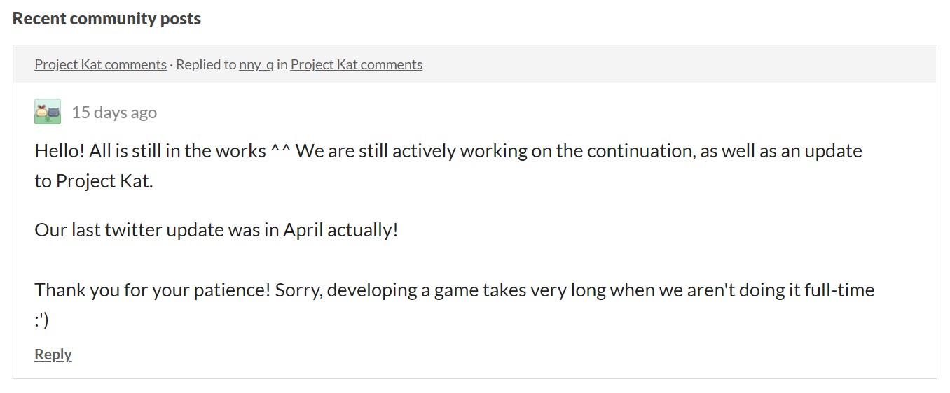 'Project Kat 의 제작에 종일 매달려서 하는게 아니기 때문에 개발 기간도 엄청 길어 지고 있답니다.'